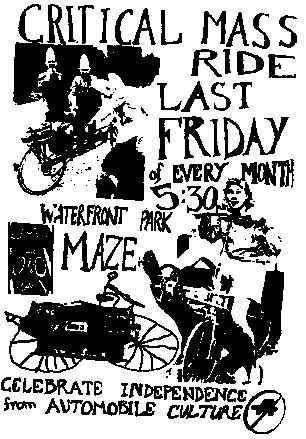 Sometime in August of '93 Sara spots dozens of flyers around town that go something like "Tired of being run off the road by cars? Of riding alone, afraid, intimidated? Come to a Critical Mass planning meeting..." She's been especially frustrated with car behavior recently, so the invitation strikes a chord. On the appointed day, I accompany her down to the Howling Frog Cafe, but don't pay much attention to the proceedings,only noting the 20 or so cyclists of widely varying aspect, mostly listening to some folks from San Francisco rant about cars.