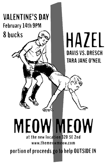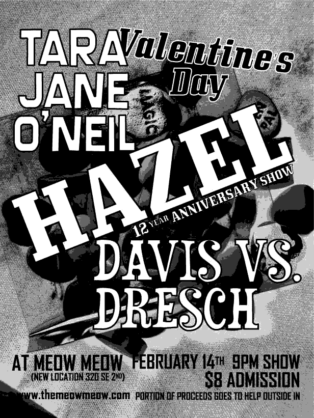 we would love to open for hazel. unfortunately, due to the fact that i have been in california these past few months, we have not had enough practice to play in early february. i don't move back to portland until mid-march. i am sorry that i will miss your show, i hope it goes well. thanks for asking.
